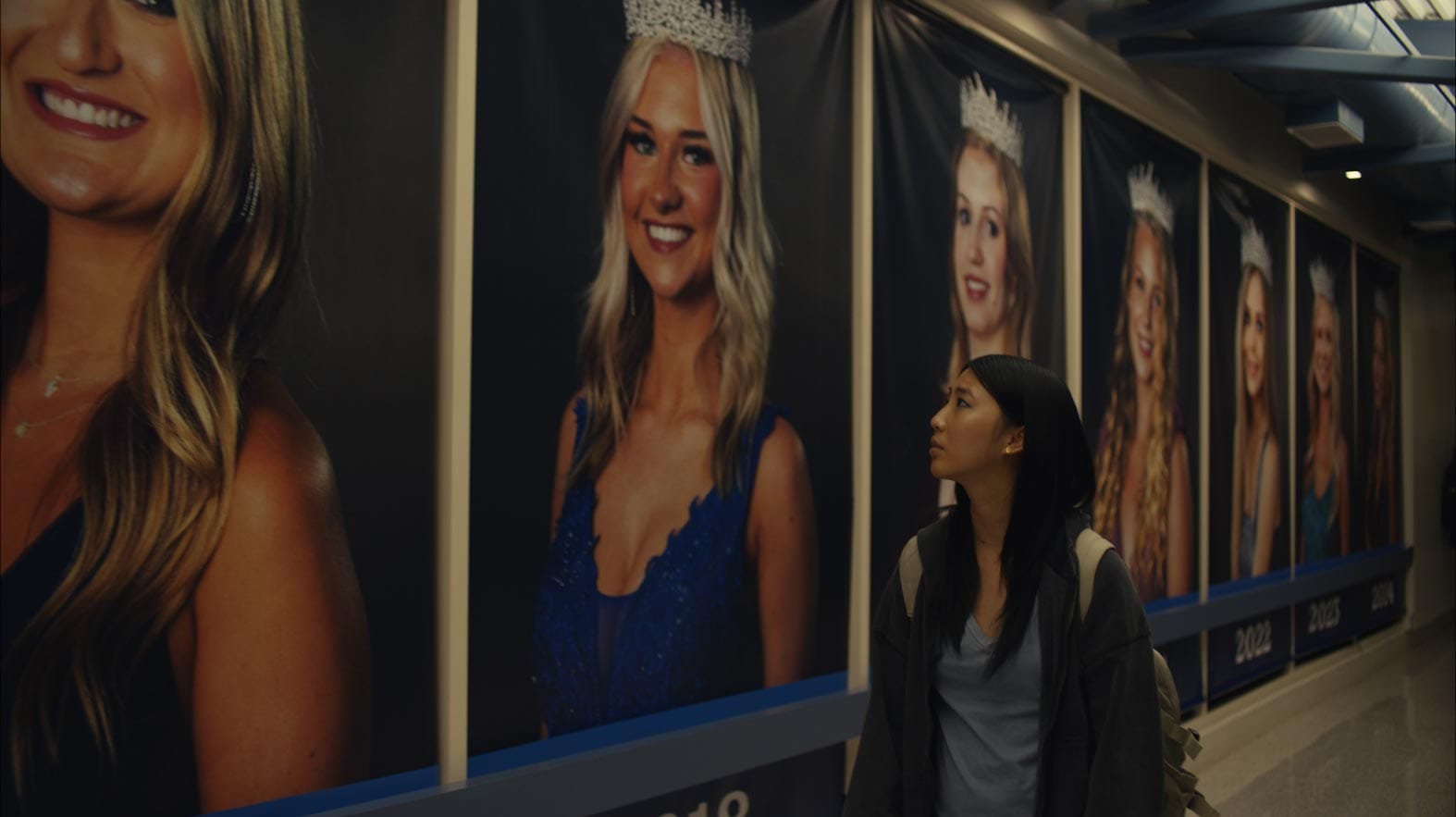 A young woman walks down a hallway lined with portraits of pageant winners wearing crowns and blue dresses.