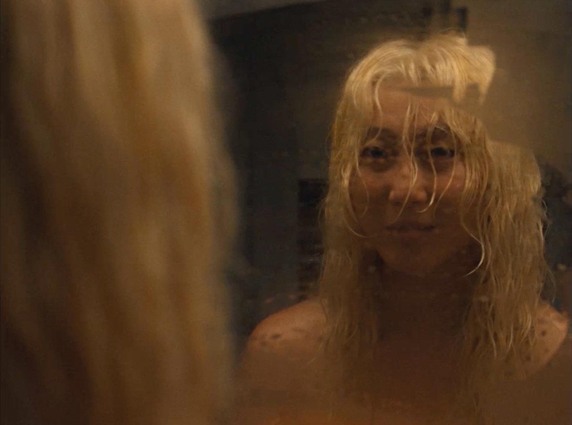 A woman with wet blond hair looks at her reflection in a fogged bathroom mirror.