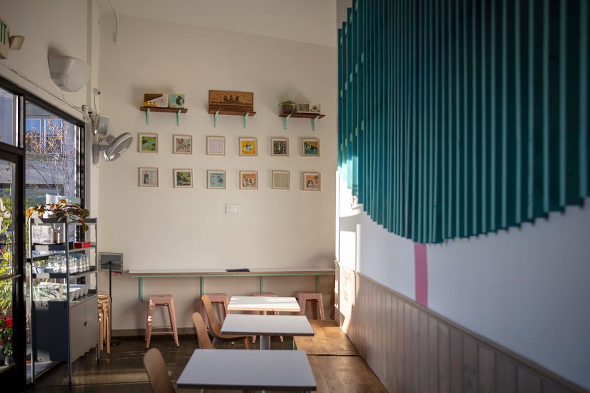 Her Oakland restaurant, however, bears no hint of this tumultuous past. The decor is vibrant and playful, hung with album covers of Cambodian records and custom wallpaper by Cambodian American illustrator Ratha Nou that combines Khmer singers and Oakland landmarks. It’s an homage to her parents, as well as to the Cambodian golden age of the ’60s and ’70s in which they grew up.